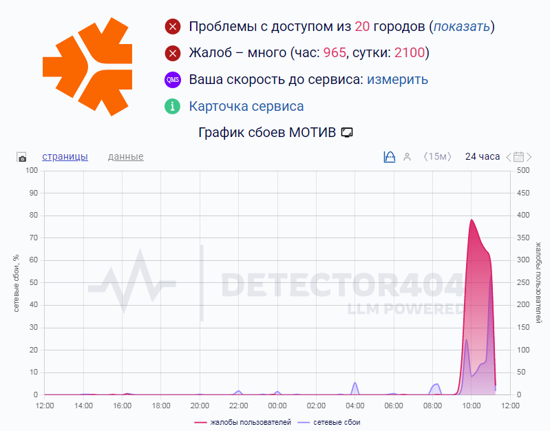 Утром 8 октября по всей Свердловской области пользователи местного оператора связи «Мотив» начали массово жаловаться на сбои в работе мобильного интернета. Системность проблемы подтверждает онлайн-система мониторинга сбоев DownDetector.