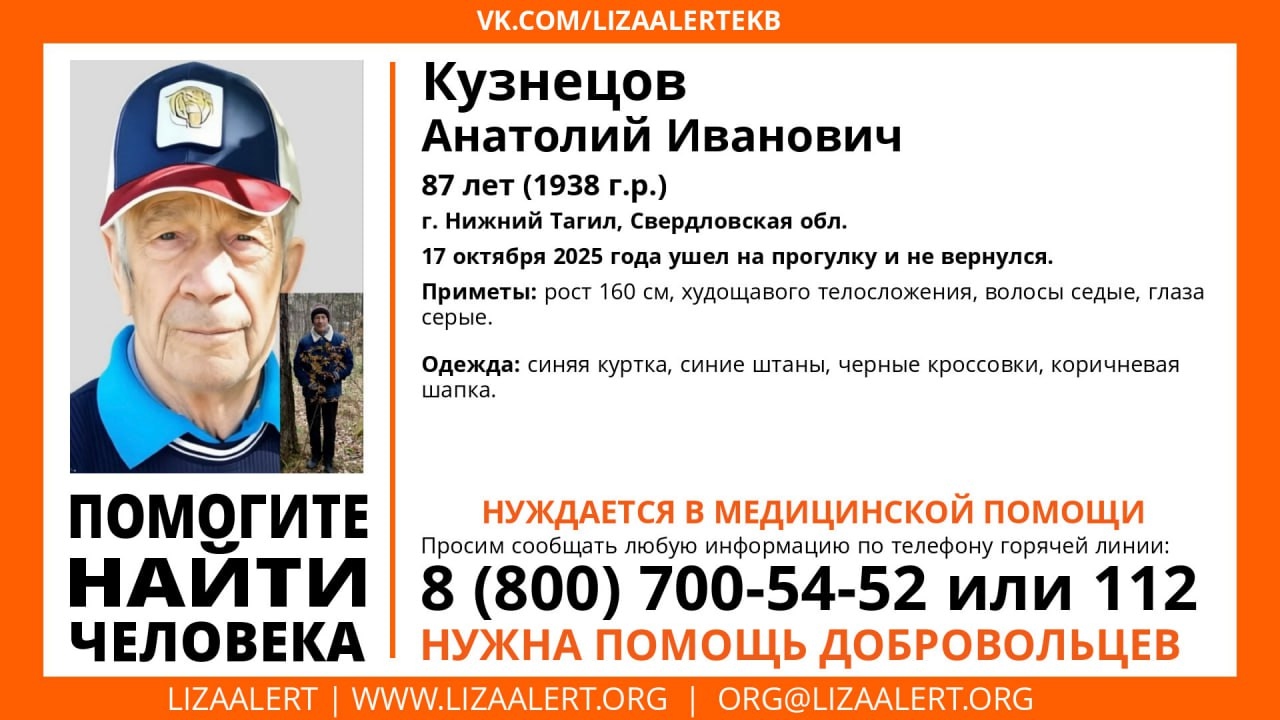 Тагильчанин нуждается в медицинской помощи, поэтому важно как можно быстрее разыскать его. Если вы видели похожего человека или знаете, где он может находиться, звоните по телефону горячей линии отряда «ЛизаАлерт» 8-800-700-54-52 либо по номеру 112.