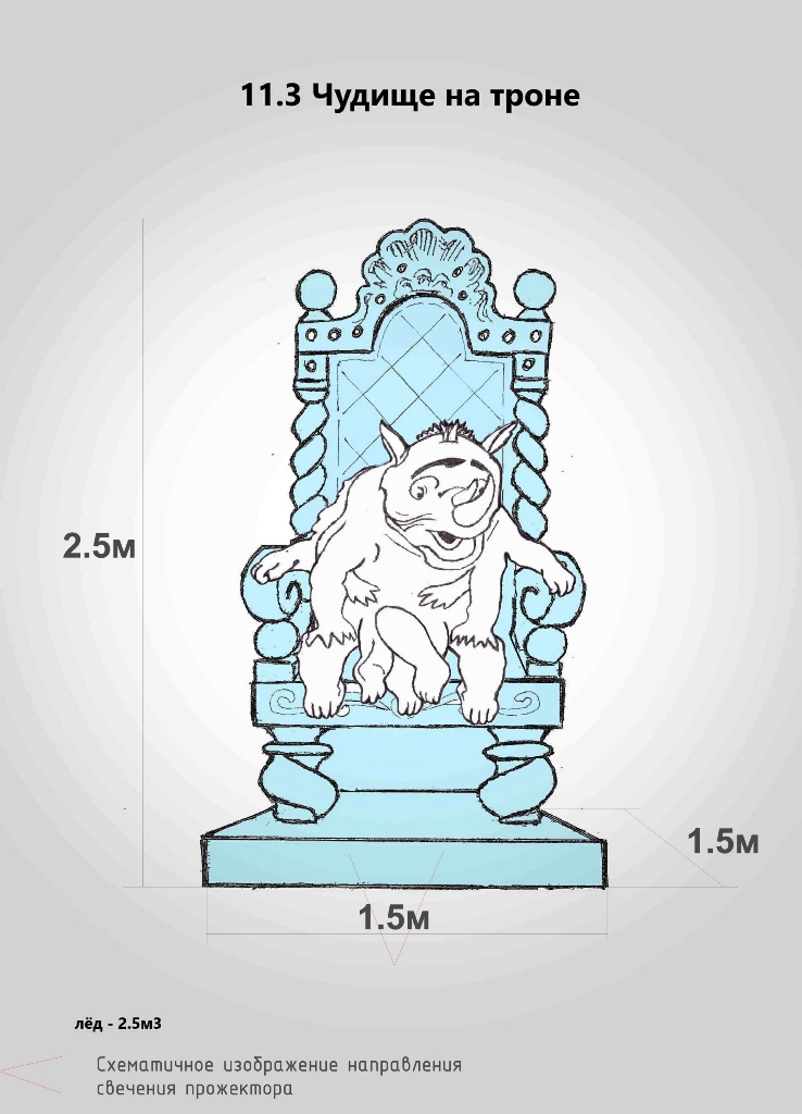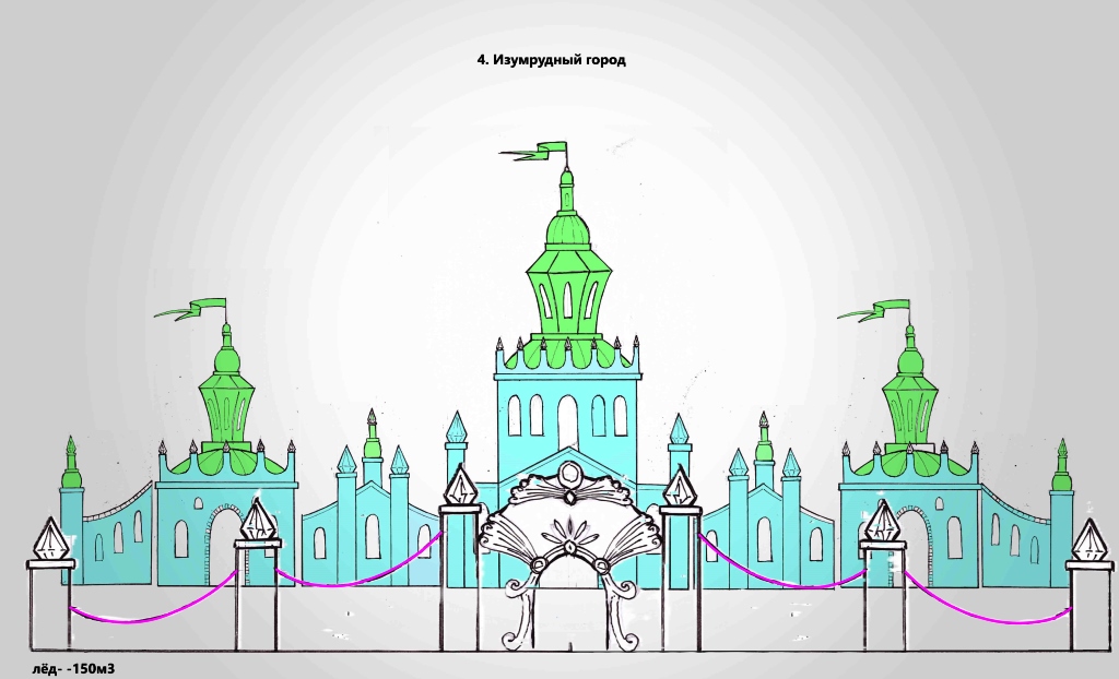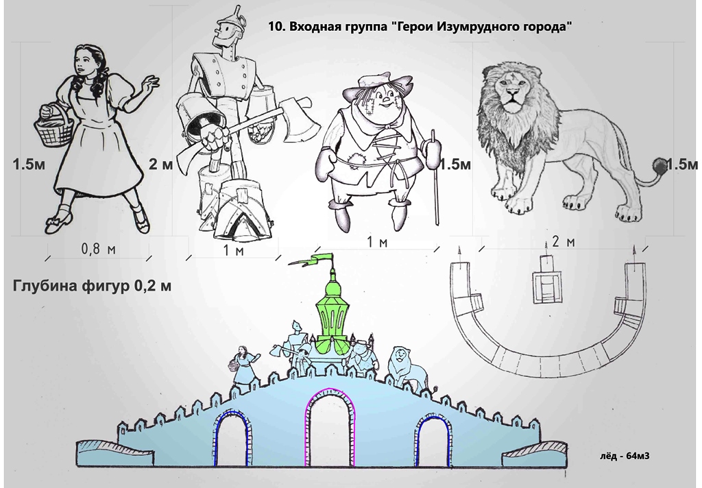 Гостей ледового городка у памятника Черепановым будут встречать главные персонажи произведения: Элли, Страшила, Железный Дровосек и Трусливый Лев. Ограждение изо льда стилизуют под дорогу из желтого кирпича. В периметре тагильчан ждет встреча с Гудвином в разных обликах: в виде русалки, чудища, большой головы и огненного шара. У Центральной библиотеки из ледовых блоков соорудят масштабный Изумрудный город — ансамбль из башен, замковых стен, лабиринтов.