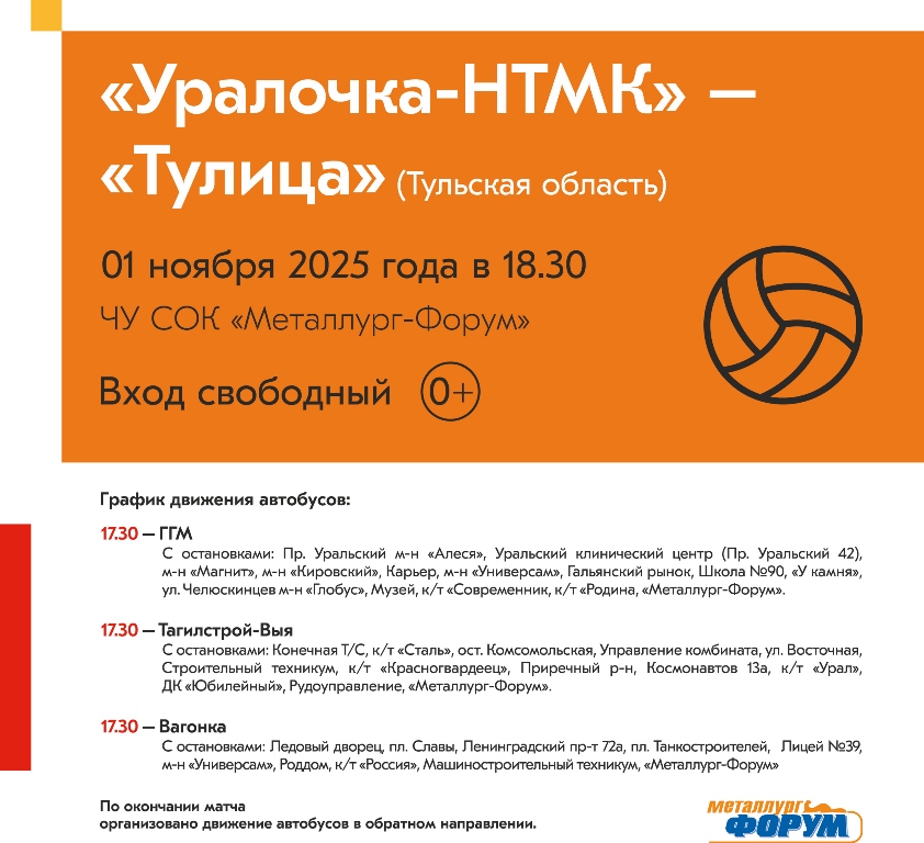 На старте Чемпионата России у свердловской команды три победы и два поражения. В турнирной таблице она идет третьей. Следующий матч Суперлиги «Уралочка-НТМК» снова проведет на домашней площадке – в Нижнем Тагиле команда сыграет с «Тулицей». Спортсменки говорят, что помогают не только стены, но и земляки. Встреча пройдёт в эту субботу 1 ноября в 18:30 в «Металлург-форуме». ЕВРАЗ НТМК поможет с транспортом – болельщиков из разных районов доставят автобусы. Вход для зрителей свободный.