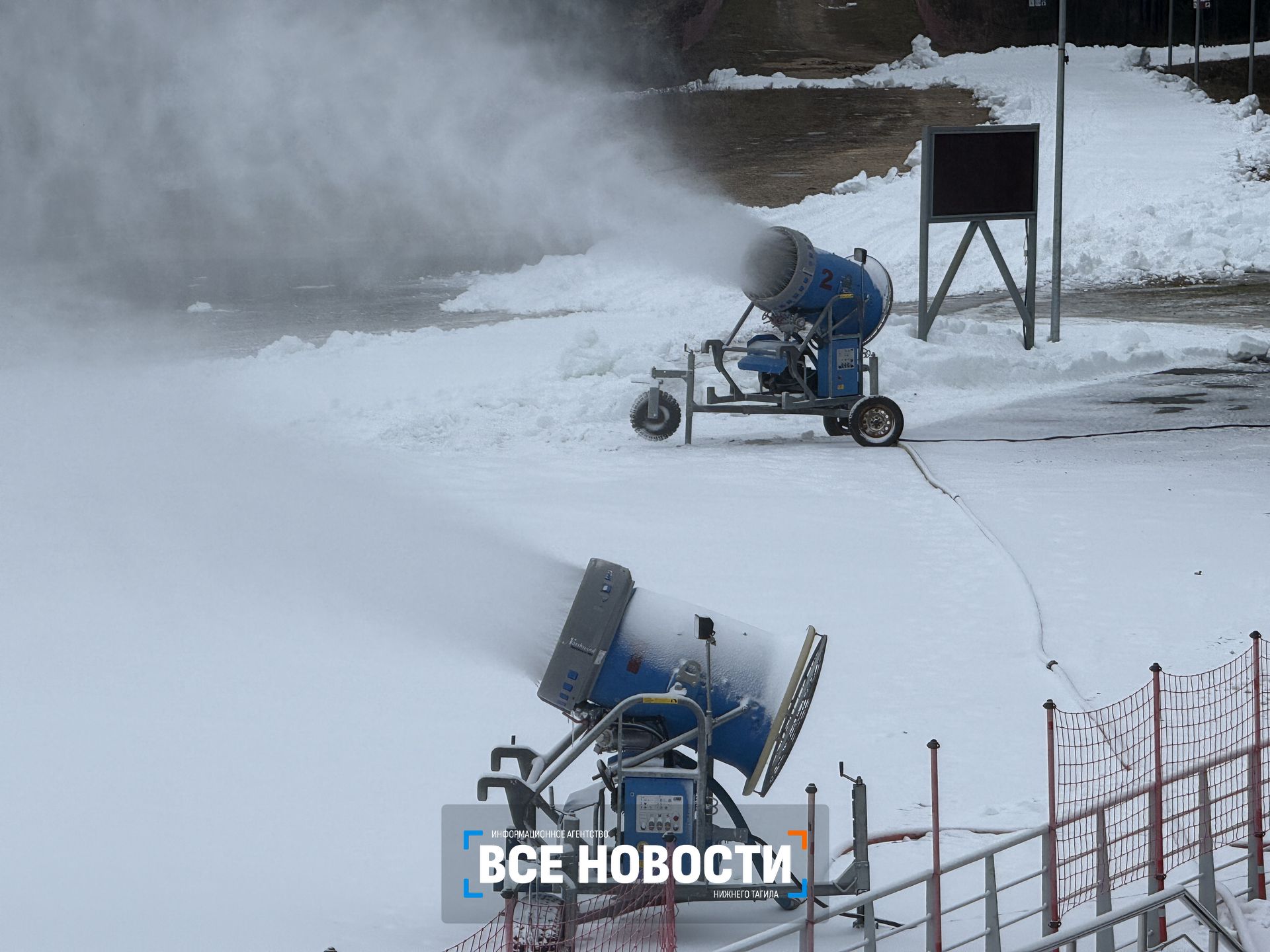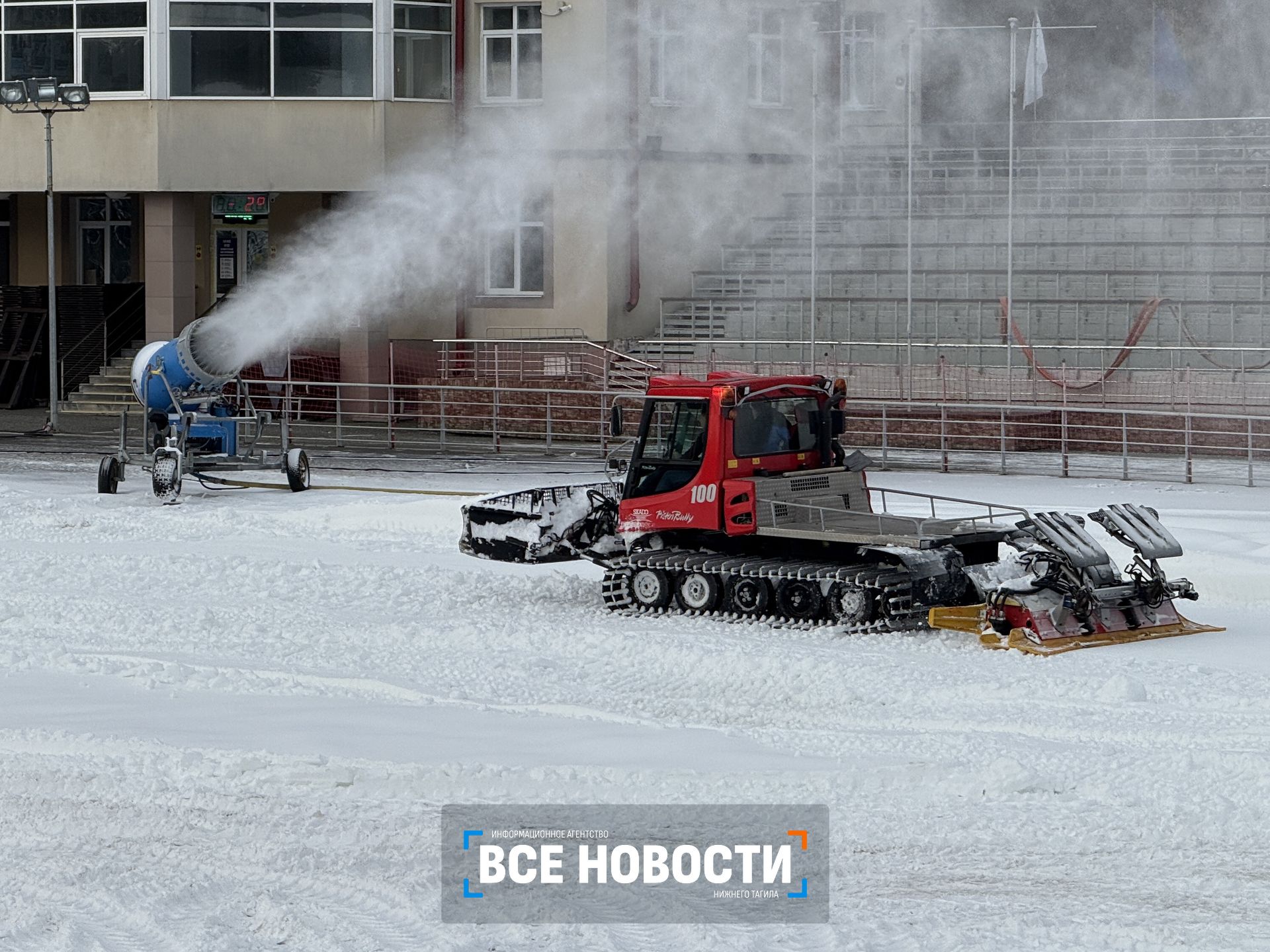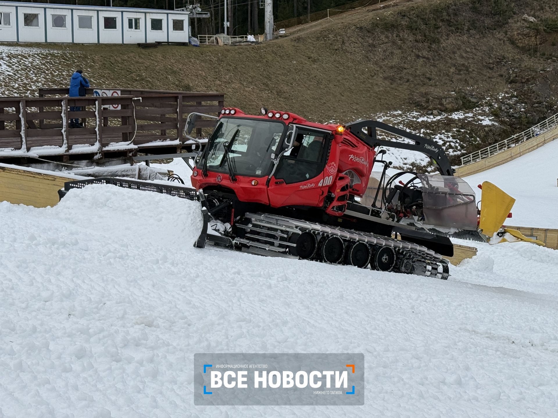 Сейчас выравнивают и трамбуют снег на 90‑метровом трамплине. Там работает ратрак — специальный гусеничный тягач. Мелкие недочёты технический персонал устраняет вручную. Спорткомплекс начали готовить неделю назад и уже близки к завершению. По нормам FIS (Международная федерация лыжного спорта) мощность снежного покрова на всей протяжённости трамплина должна составлять 35 сантиметров. По соседству, на самом большом 120‑метровом трамплине, работают три снежных пушки. Будет ли он готов к турниру, пока не ясно, говорят специалисты. Всё зависит от погоды и температурного режима.