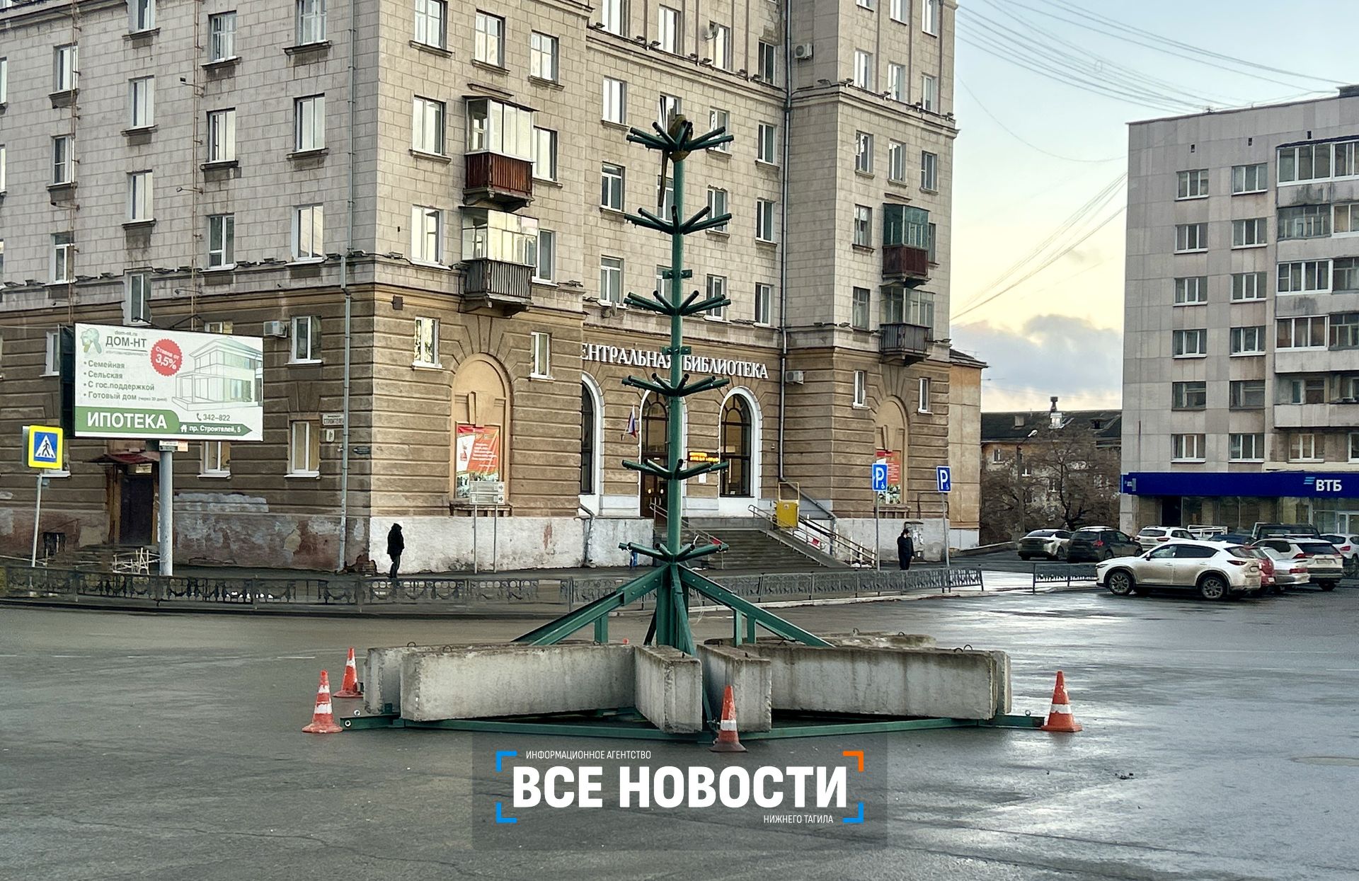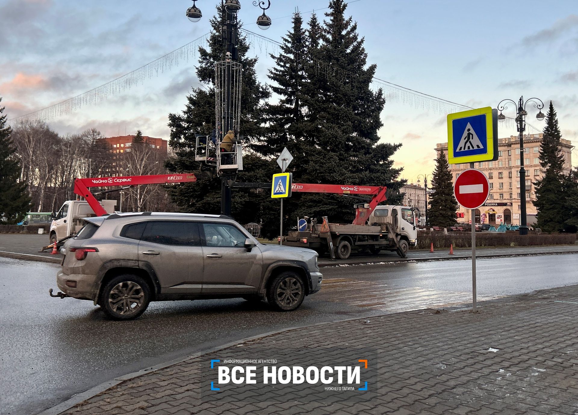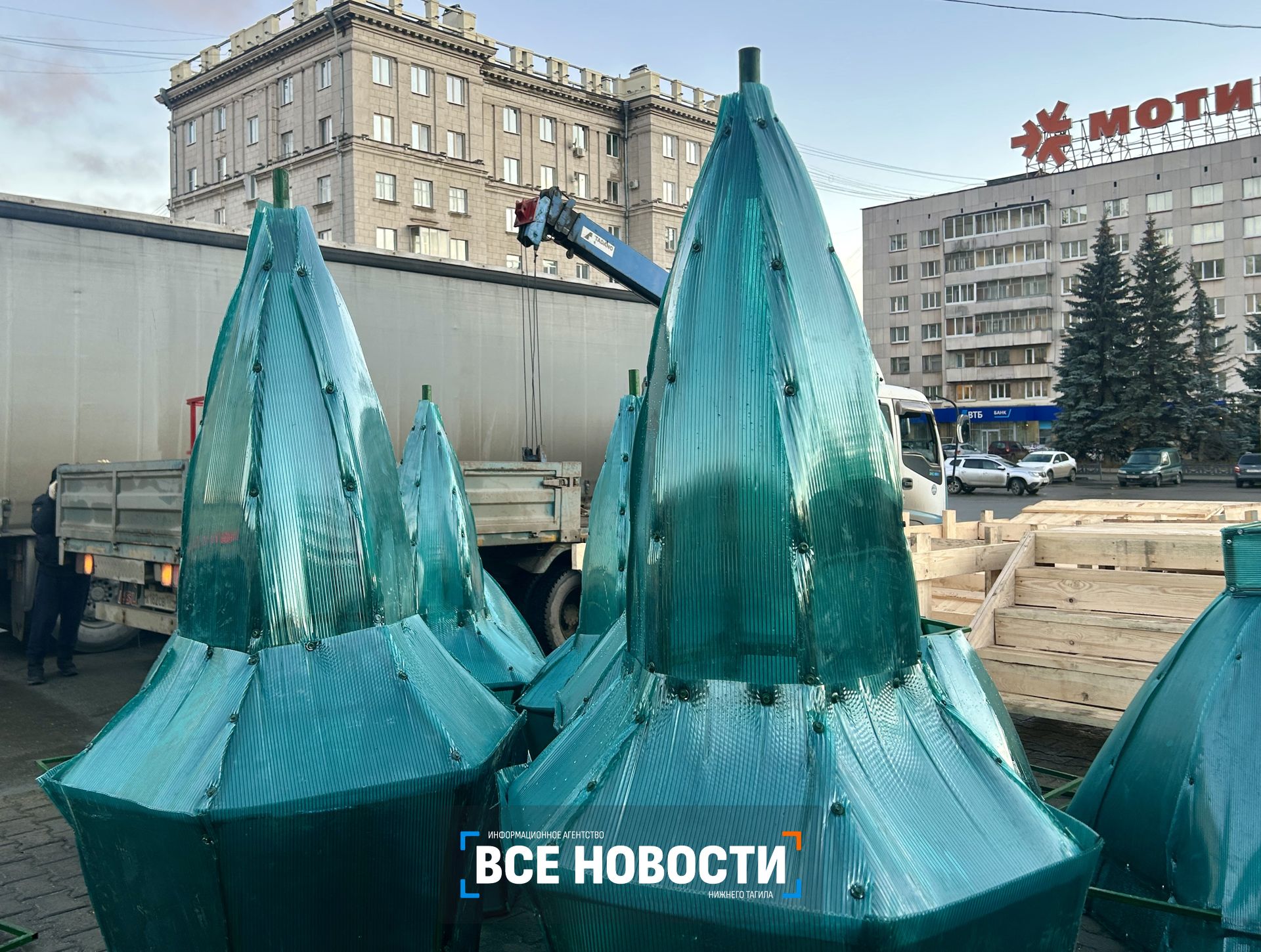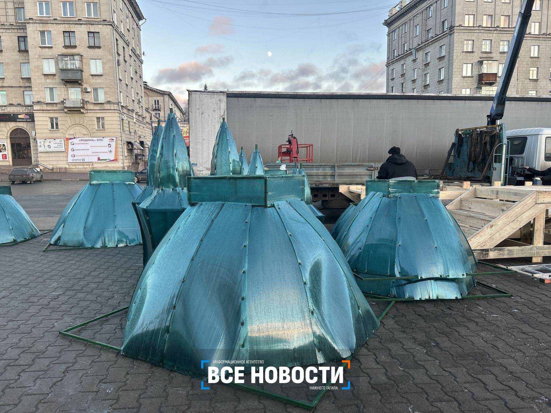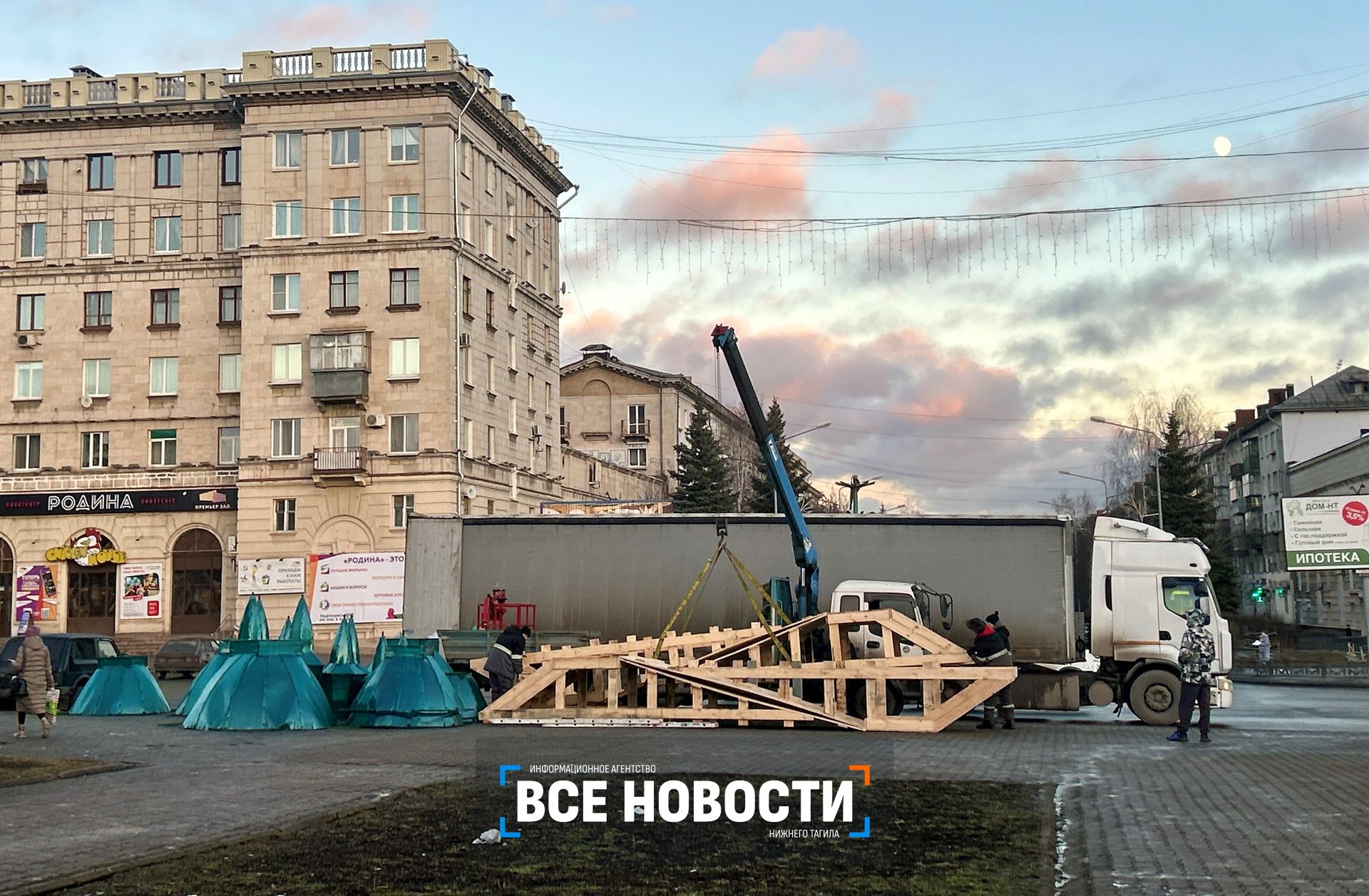 На Театральной площади начали сооружать новогодний городок, правда, пока без льда и снега. Подрядчик привёз башни будущего Изумрудного города, а Центр организации дорожного движения устанавливает 18-метровую ель и развешивает гирлянды.