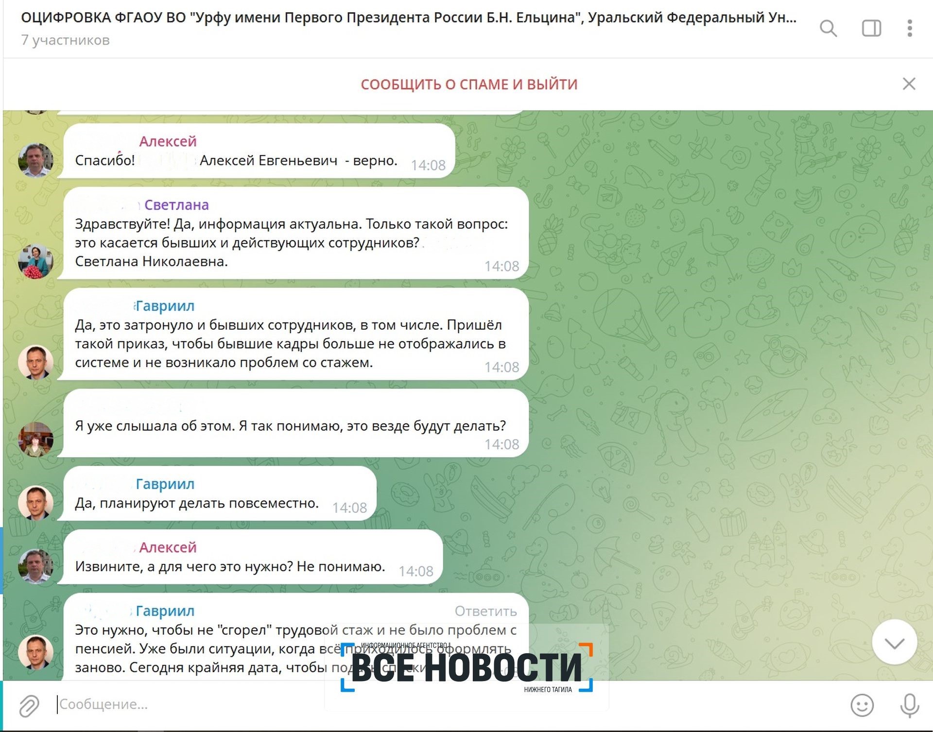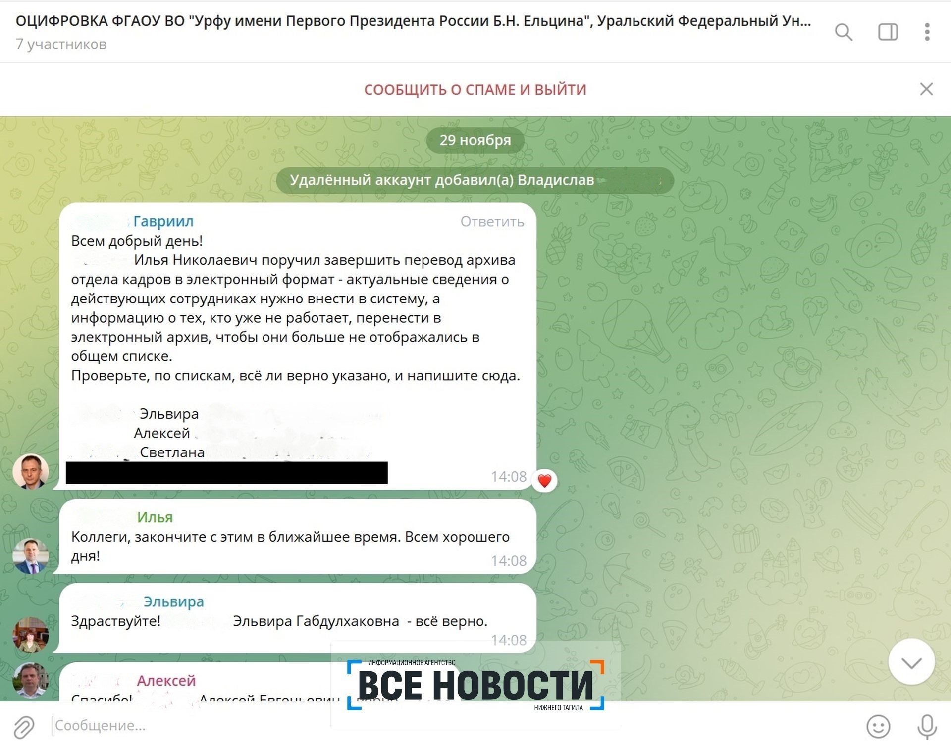 Как рассказал Владислав ИА «Все новости», в мессенджере его добавили в группу, где решался срочный вопрос. В чате, кроме него, было шесть участников. Все они якобы работают в УрФУ: мошенники скопировали фотографии, фамилии и другие персональные данные действующих сотрудников. Среди них были, например, фейковый ректор Илья Обабков, главный бухгалтер вуза Гавриил Агарков, доцент Светлана Лапшина.