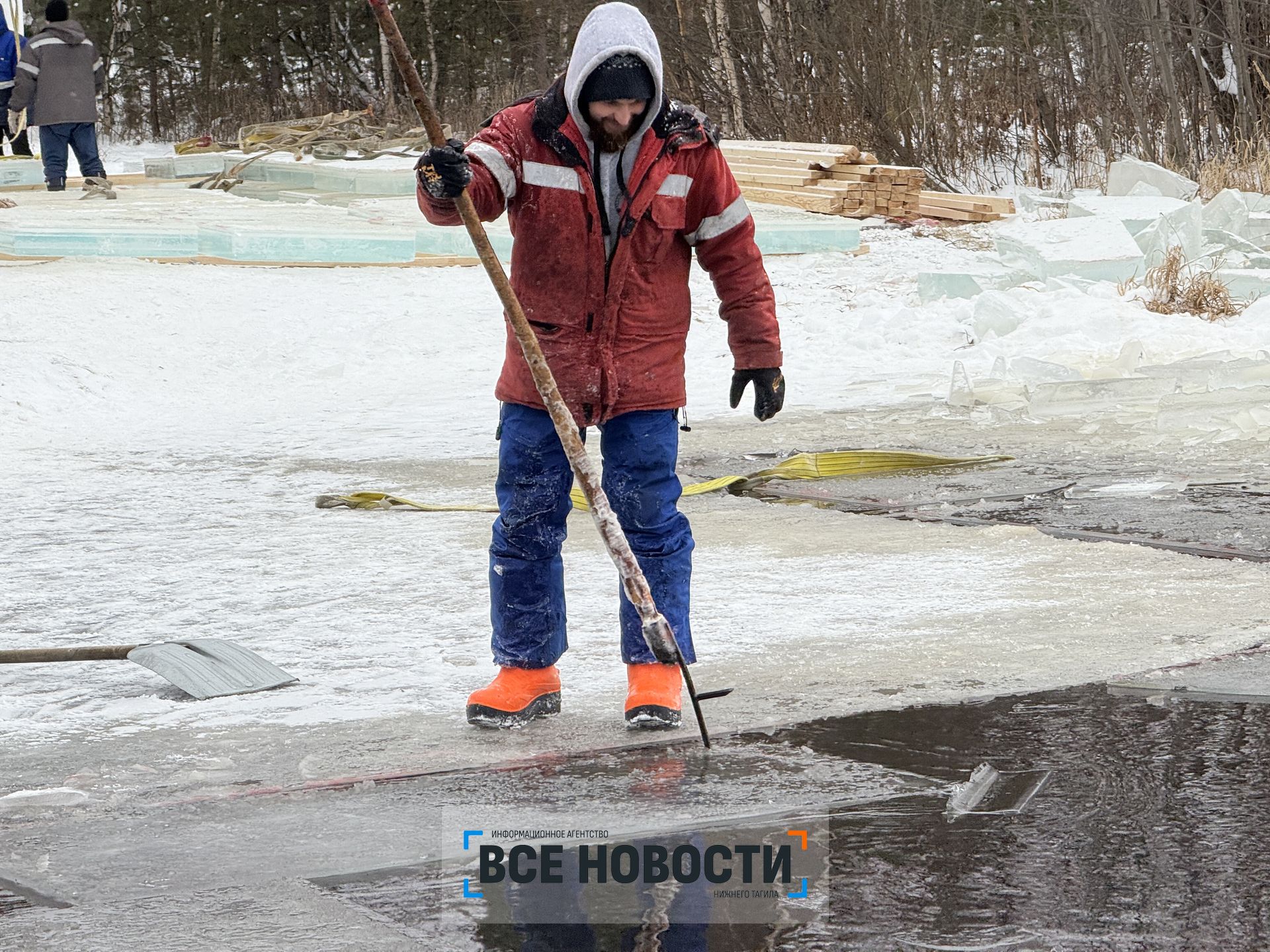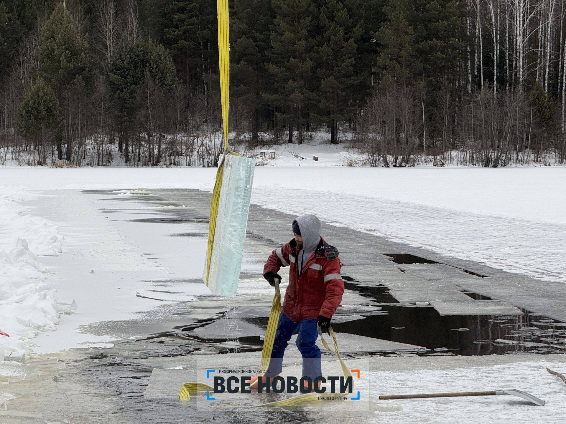 Идеальная погода для намерзания льда около −10 градусов. На его качество влияют перепады температур, её стабильность, чистота водоёма. На этот раз строителям повезло — из воды они достают прозрачный материал с голубым отливом.