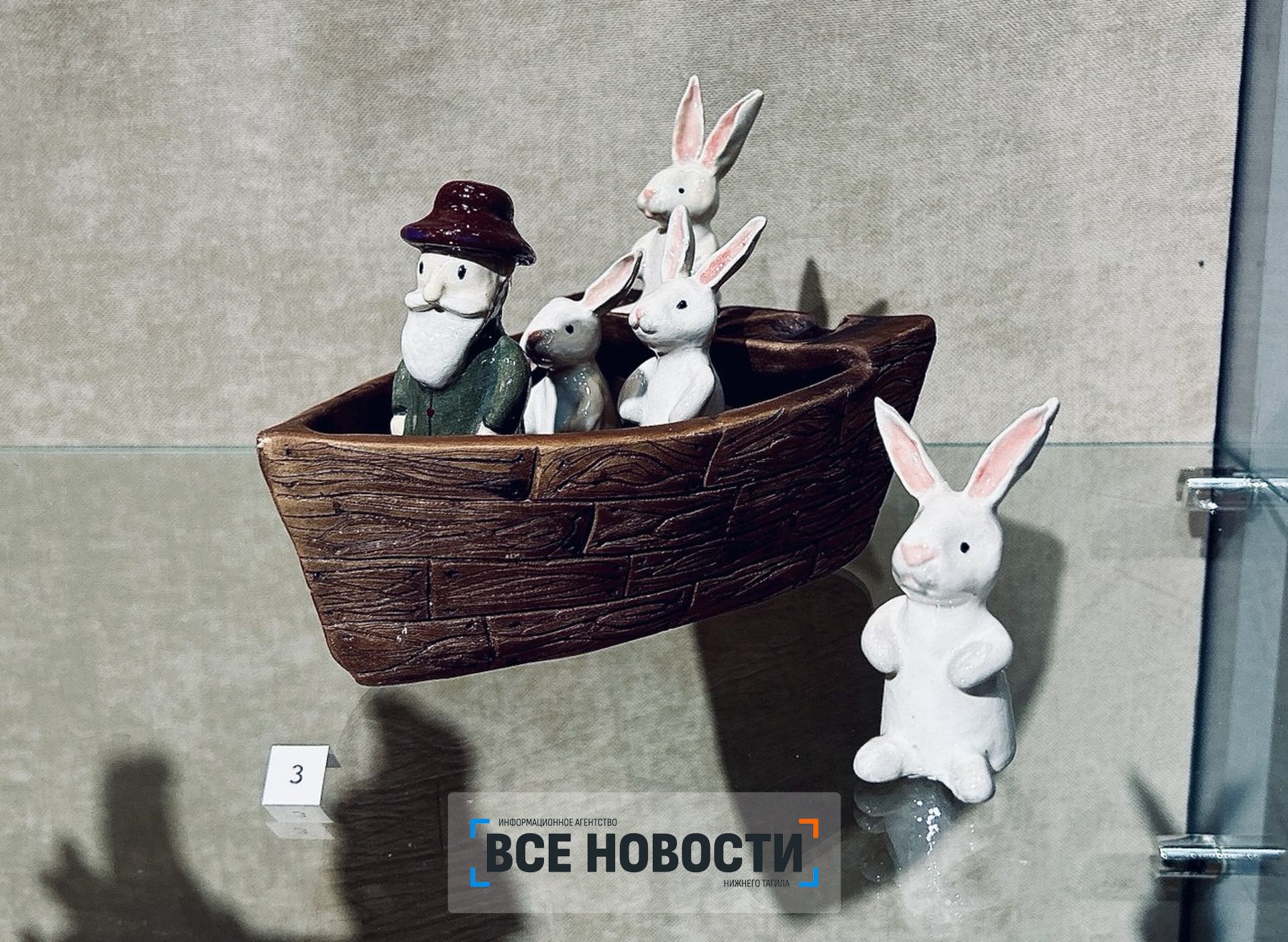 Каждая фигурка новой выставки «Чудо-кони, чудо-птицы» заставляет задержаться и присмотреться к деталям. Здесь и необычные птицы, и милые коники, и пары дам с кавалерами, и забавные зверьки. Среди них лодка с дедом Мазаем и зайцами. Её создала для выставки 14-летняя Софья Мухомедзянова, самая юная участница экспозиции.