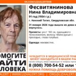 В Нижнем Тагиле пропала 91-летняя пенсионерка. Она ушла в неизвестном направлении — поиски ведут волонтеры и родственники. Как уточнили в отряде «ЛизаАлерт», 91-летняя Нина Фесвитянинова живет одна в центре города, сама себя обслуживает, но иногда случаются проблемы с памятью. Родственники проведывают бабушку каждый день, но в субботу 31 января застали пустую квартиру. Скорее всего...