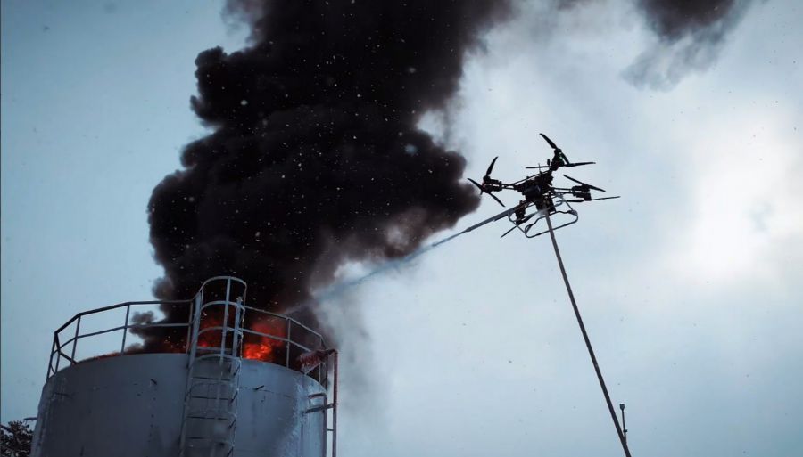Такие пожары считаются одними из самых сложных на промышленных объектах. Дрон поднялся на высоту 12 метров, с помощью тепловизора провел разведку и подал огнетушащее вещество прямо в очаг возгорания. Испытания проводились в связке с наземной установкой компрессионной пены. На развертывание комплекса ушло 5–10 минут, полное тушение заняло всего 3,5 минуты.